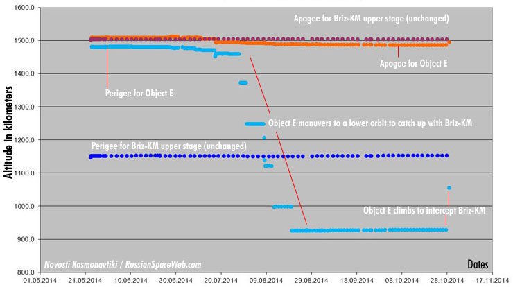 The perigee (the lowest point in orbit) for a mysterious Object 2014-028E (or simply Object E) went down quickly in July and August (light blue line) allowing the spacecraft to catch up with an inert Briz-KM stage (dark blue line), which originally delivered it into orbit on May 23, 2014. Then, at the end of October, Object-E sharply climbed back seemingly aiming to intercept the Briz. What is going to happen next is anybody's guess. Credit: The online forum of the Novosti Kosmonavtiki magazine