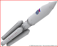 Angara-5 variants: The original version of the Angara-5 rocket with the Briz-M upper stage (left); its "beefed up" variant featuring the KVTK hydrogen-powered stage (2nd from left); Angara-5P (center) shown as a two-stage variant, which was later updated to a three-stage version; Angara-5V (2nd from right), featuring a hydrogen powered third stage adapted from the Rus-M project; it is also topped with the beefed up KVTK stage; (right): Angara-5V with the PTK NP spacecraft and Block DM-based upper stage. Copyright © 2015 Anatoly Zak