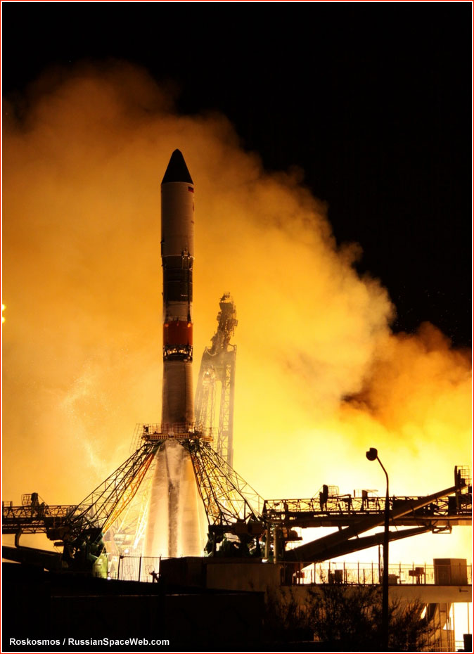 Egyptsat-2 enters orbit The launch of the Soyuz-U rocket took place as scheduled on April 16, 2014, at 20:20:00 Moscow Time (12:20 EST) from Site 31 in the Baikonur Cosmodrome in Kazakhstan. The launch vehicle was carrying a Russian-built Egyptsat-2 satellite designed to provide high-resolution imagery for the Egyptian military and other government agencies in the country. The spacecraft was successfully delivered into its planned orbit 520 seconds after liftoff. The development and launch campaign for Egyptsat-2 has been conducted largely in secret. Only one visual of the operational spacecraft was released to the public by its manufacturer RKK Energia after the successful launch. Notably, in its post-launch press-release, the company avoided the use of name Egyptsat-2, instead identifying the satellite as a "spacecraft for optical-electronic observation developed for the foreign customer." RKK Energia announced that the satellite had been inserted into a 720 by 440-kilometer orbit with an inclination 51.6 degrees toward the Equator. Its ground facility established control over the satellite at 21:52 Moscow Time, the company said. Western radar detected two objects in orbit with similar parameters, probably representing the satellite and the third stage of the Soyuz-U launch vehicle. The satellite was expected to use its own propulsion system to enter a final operational orbit.
