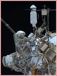 Soyuz TMA-10M approaches the ISS around 20 minutes before planned docking on Sept. 26, 2013. Credit: NASA TV Oleg Kotov and Sergey Ryazanskiy during a spacewalk on Dec. 28, 2013. Credit: NASA |