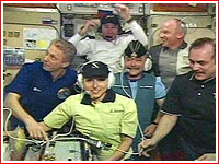 Crewmembers of the Soyuz TMA-8 and Soyuz TMA-9 spacecraft meet onboard the International Space Station on September 20, 2006. Credit: NASA