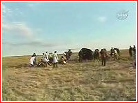 Camera installed on a ground support and rescue vehicle, shows the descent module of the Soyuz TMA-9 spacecraft minutes after landing Saturday, April 21, 2007. Credit: NASA