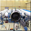 Shortly after its encapsulation under the payload fairing, Progress is installed back into its work site for final tests. Click to enlarge. Credit: NASA