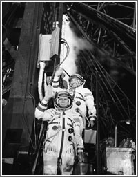 Popovich (top) and Artyukhin bid farewell to well-wishers at the steps of the launch pad elevator that would take them to their spacecraft.