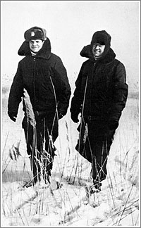 Georgy Grechko (left) and Aleksei Gubarev inside the Salyut-4 simulator.