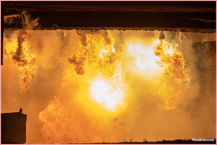 Launch of a Soyuz rocket with Progress MS-18 cargo ship on Oct. 28, 2021, with some of the ignition sticks still visible on the vernier engines.