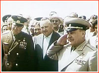 Top Kremlin officials on the phone with Tereshkova (left to right): Mikoyan, Khrushchev and Brezhnev. Dual mission On June 17, at 10 a.m., Kamanin started his shift at the communication post in Tyuratam. He learned that both cosmonauts had a good sleep lasting eight hours and Bykovsky had a pulse of 48-56, while Tereshkova recorded 64-72. Bykovsky reported that he had had great communications not only with the ground, but also with Tereshkova onboard Vostok-6. "She is singing me songs," he said. (574) However he later reported that despite all his efforts he could not find Tereshkova's ship in the sky. In turn, Tereshkova did say that she had established contact with Bykovsky on the night side of the Earth and at one point saw a star three times brighter than Vega, which she thought could be Vostok-5. According to official Soviet sources, the two ships came as close as five kilometers to each other during the first orbit of Vostok-6. (505) However after their maximum proximity, the two spacecraft started drifting apart and communications also became difficult to maintain. By the middle of the second day of the joint mission radio-contact completely broke down, even though Tereshkova could still hear some messages addressed to Bykovsky. Despite Vostok-5's excellent technical shape, the pessimistic prognosis about its orbit decay turned out to be right -- the spacecraft was losing its altitude faster than expected. (466) The State Commission convened from 11:30 to 13:00, where it was reported that Vostok-5 would naturally reenter the Earth's atmosphere after just 7.1 days. To prevent uncontrolled reentry, it was decided to shorten the mission to 5-6 days, while keeping Vostok-6 in orbit for three days instead of one, given Tereshkova's seemingly successful flight. Under such a scenario, the two spacecraft would return home on the same day. However the decision on the exact landing time was postponed until the evening of June 18. Kamanin made two communications sessions with Tereshkova and remembered her reporting good health, good parameters in the cabin and her intention to fully complete the mission. However, at least some controllers construed her answers about her health as evasive. (574) One of ground control officials, with the typical condescending attitude that would later accompany many commentaries about Tereshkova's flight, claimed that her voice communications were "almost unintelligible." (262) As Tereshkova would later explain in her post-flight reports, she started feeling pain in her right leg on the second day of the mission, which would become really bothering by the third day. She also started feeling pressure from the helmet in the shoulder area, while her audio headgear started irritating her left ear. (Bykovsky would also complain about his helmet in the post-fight debriefing.) Finally, when she tried to eat, she suddenly vomited, but she attributed its cause to the bad taste of food rather than weightlessness. (231) Obviously none of this information was publicly reported at the time, however, peculiarly, the official account of the Soviet manned missions published in 1973, used word "udovletvoritelnoe" ("fair" or "acceptable") rather than "good" or "excellent," when describing Tereshkova's condition making it possible to extend her flight from one to three days. (505)
